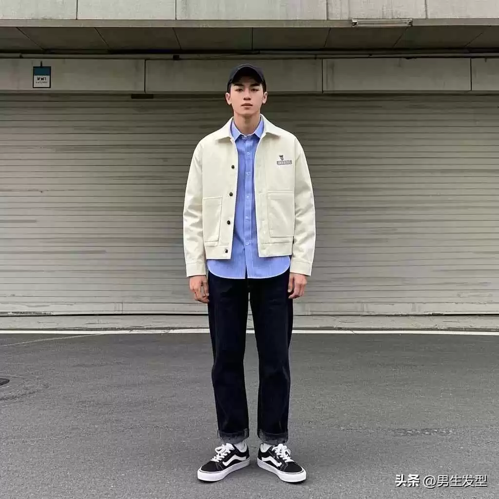 搭配要点:米白色短款外套提升腰线,内搭蓝色条纹衬衫增添文艺气息。黑色牛仔裤经典显瘦,配黑白色板鞋轻便减龄。这套春日穿搭清爽有型,矮个子男生直接照搬就行。