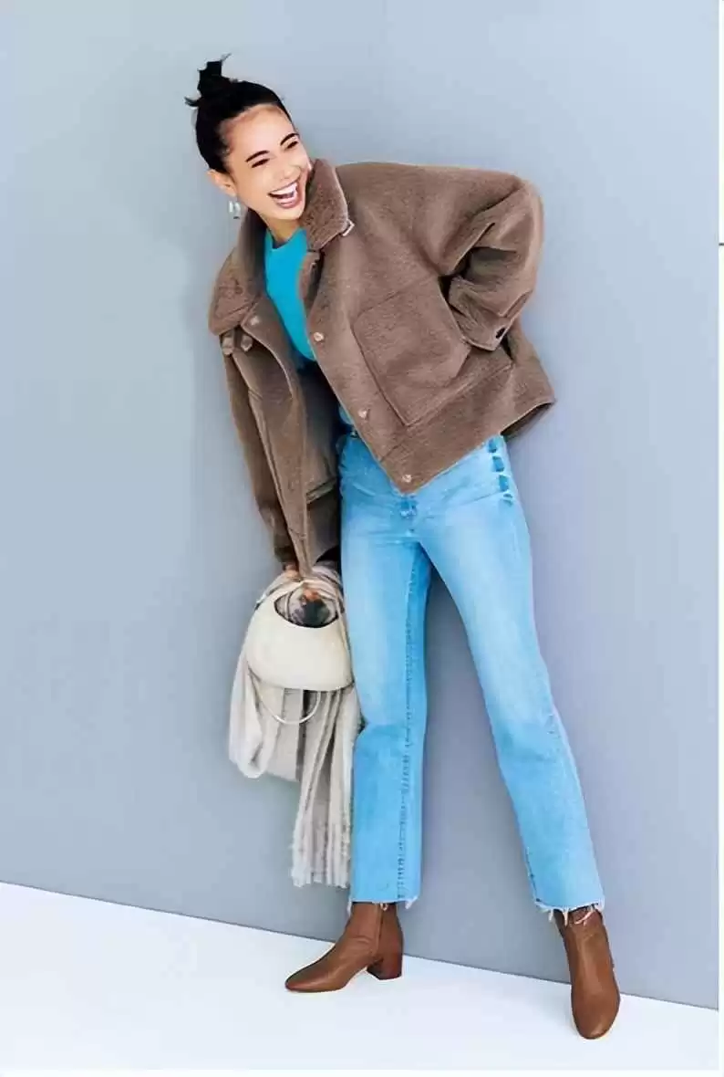 牛仔裤休闲风容易显得普通。怎么破?捷径之一是玩转配色。选择与丹宁色呼应的外套,瞬间提升看点。