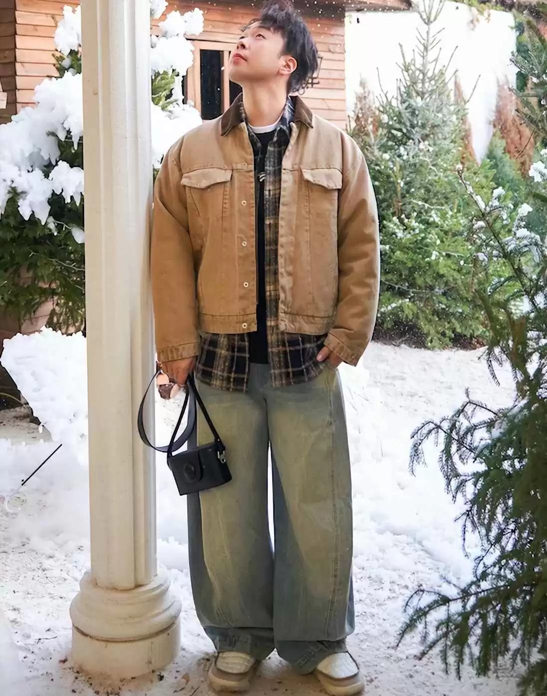 穿浅色上衣时,下身搭深色裤子“压场”。这叫“上浅下深”,既破沉闷,又通过色彩对比造层次,还把焦点引向上半身,很聪明。