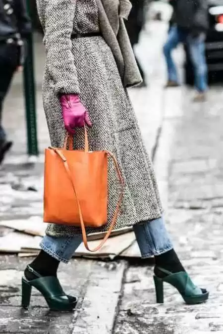 但如果你想当人群里最亮眼的那个,不妨试试撞色。一件沉稳的黑色、驼色或藏蓝色大衣,完全可以用一个亮色的包来点亮。勃艮第红、亮橘色、甚至是明年会很火的薄荷绿,都能瞬间打破冬日的沉闷,像给全身开了暖光滤镜-2-4。上海时装周街拍里,那些潮人把撞色玩得那叫一个溜-2。不过切记,亮点一个就够,包亮了,其他配饰就尽量低调。