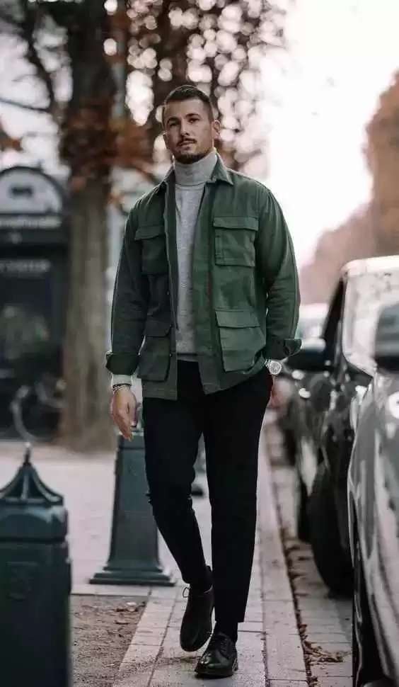 配军绿色工装夹克,沉稳不单调,绿色外套和黑裤子百搭,内搭高领毛衣让造型更丰富,色调不张扬。