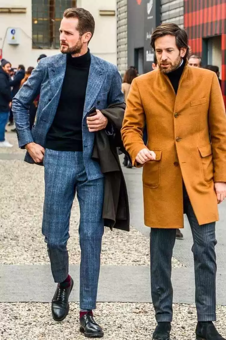 西装加高领毛衣适合日常通勤或出差,应对天气变化灵活。相比衬衫的正式,高领毛衣多了休闲感,又不失绅士味。