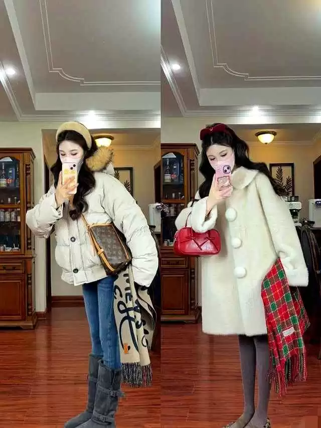 焦糖棕麂皮绒套装搭配奶白波点毛绒外套,简直是冬日绝配!焦糖棕外套自带复古感,毛绒边设计软糯又保暖,配上同色雪地靴和格纹围巾,瞬间变身街头复古甜心。奶白色毛绒外套用红色镶边点缀,吸睛度满分,波点包包和雨伞巧妙呼应,再穿条喇叭裤和红色纹路鞋,甜美感直接拉满!