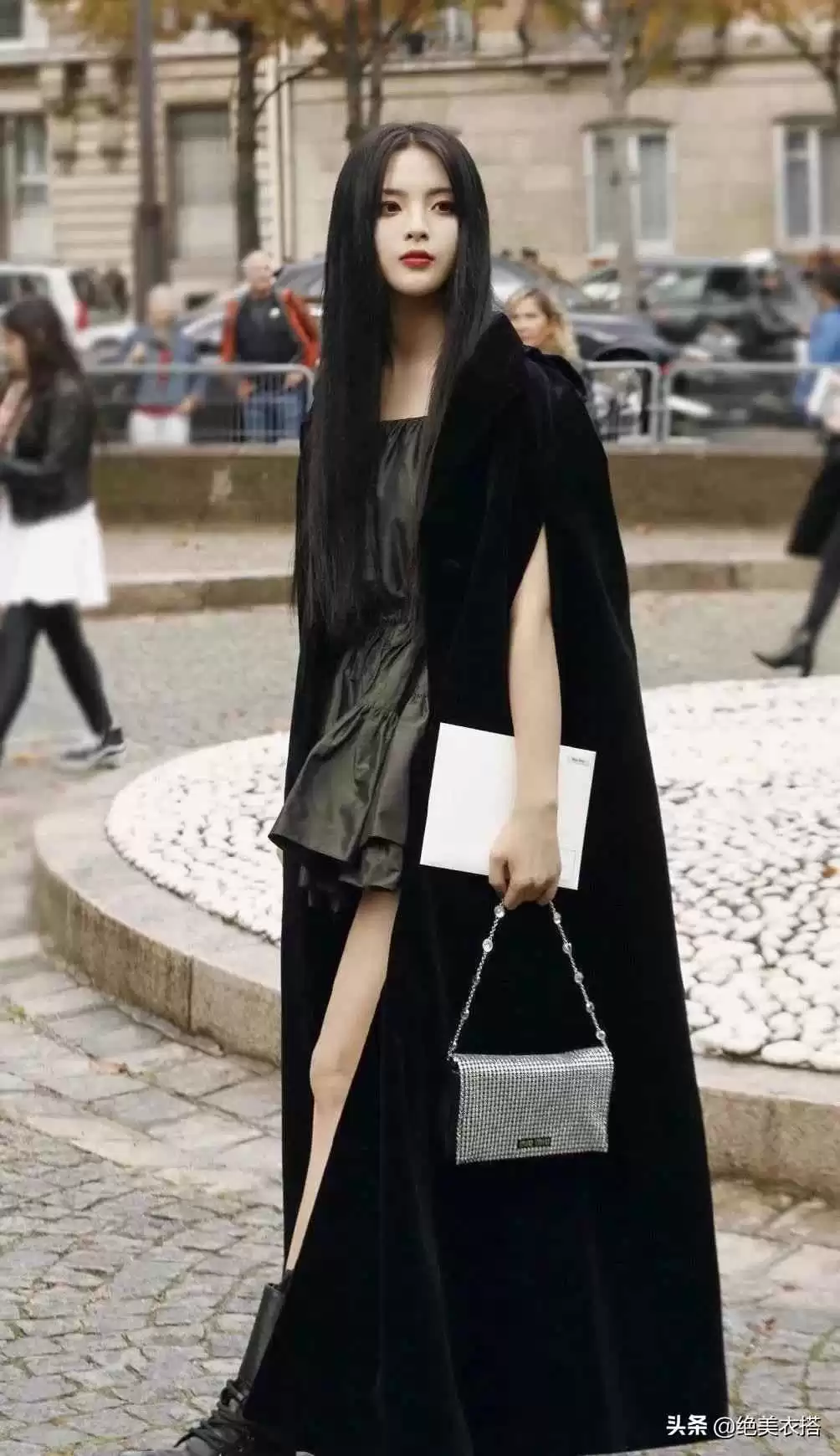 ▲比如杨超越在巴黎时装周上穿的黑色丝绒斗篷,又酷又飒,展现了她独特的青春气息。既高调又优雅,拖地长度特别吸睛。