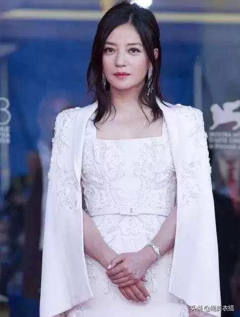 赵薇曾穿斗篷礼服,大领口修饰脸型,流畅剪裁和刺绣图案让她看起来端庄稳重。