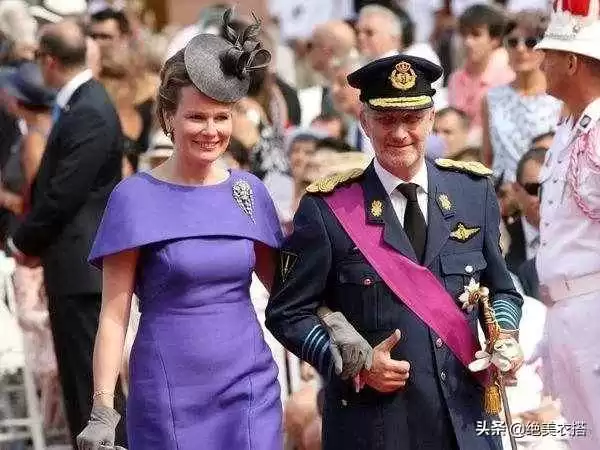 玛蒂尔德王妃的紫色斗篷礼服,颜色高贵,款式别致,斗篷部分修饰手臂,搭配修身礼服,显得得体大方。