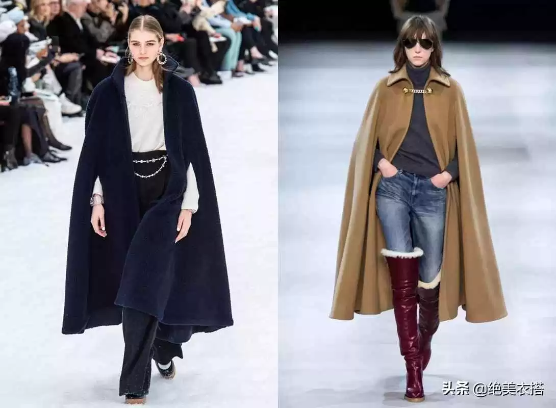 而在今年的时装周和T台秀上,斗篷元素强势回归,款式更多样。它们可能用羊绒或丝绒面料,长度也更夸张,结合了披肩和斗篷的优点,看起来特别有范儿。