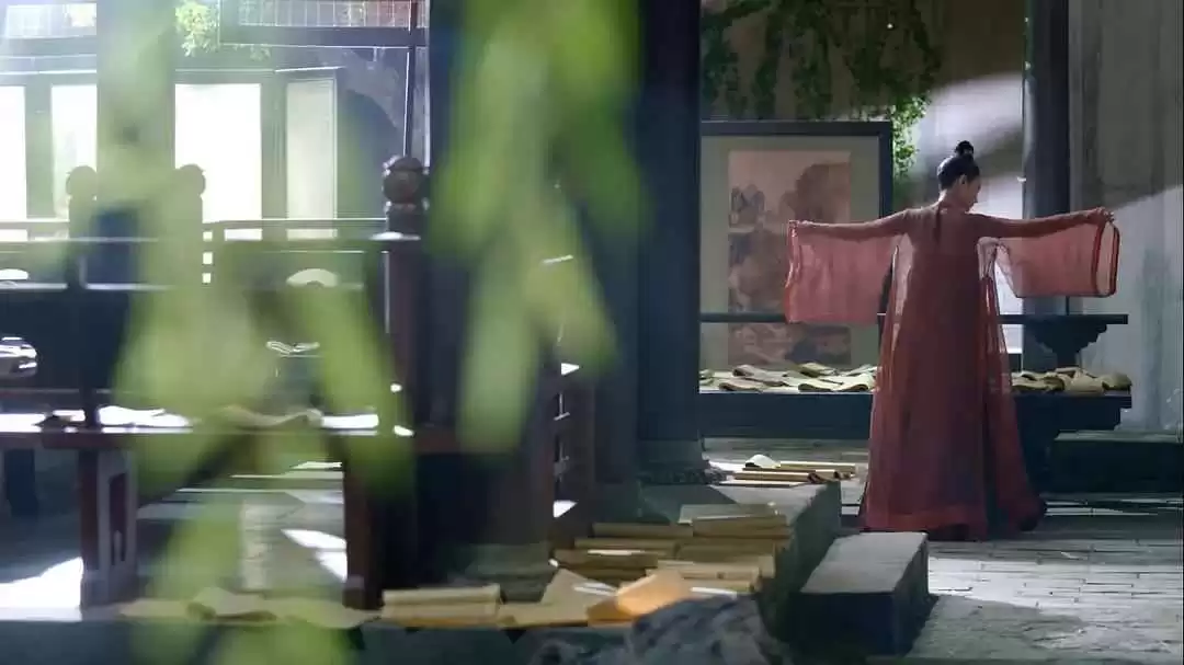 宫廷歌乐女伎穿着红色窄袖背子在院子里演奏和排练。南宋《歌乐图卷》局部。(现藏于上海博物馆)