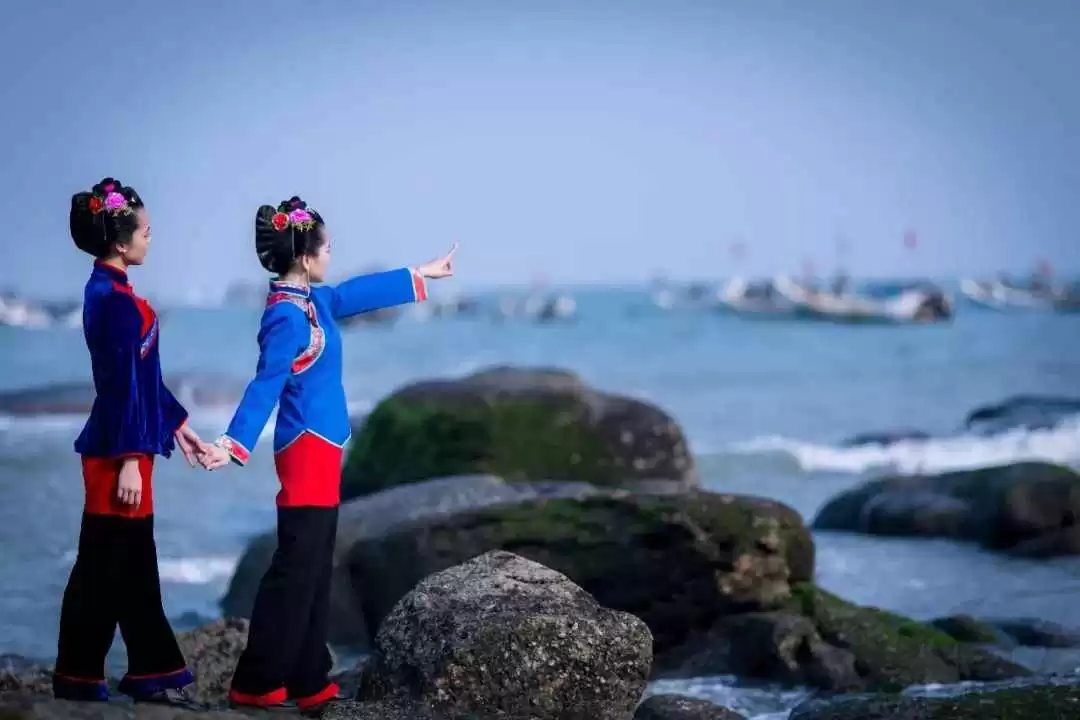 今天,如果你去湄洲岛旅游,会看到一群群漂亮的年轻女孩,统一穿着特色服装——海蓝色的斜襟中式上衣,下黑上红的裤子,头上的扁平发髻像一艘帆船。