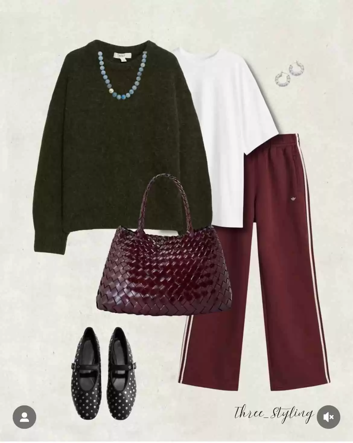 遇到颜色偏暗的橄榄绿毛衣时,用浅蓝色项链提亮肤色,酒红色裤子和编织包增加复古元素,细节处满满都是巧思。