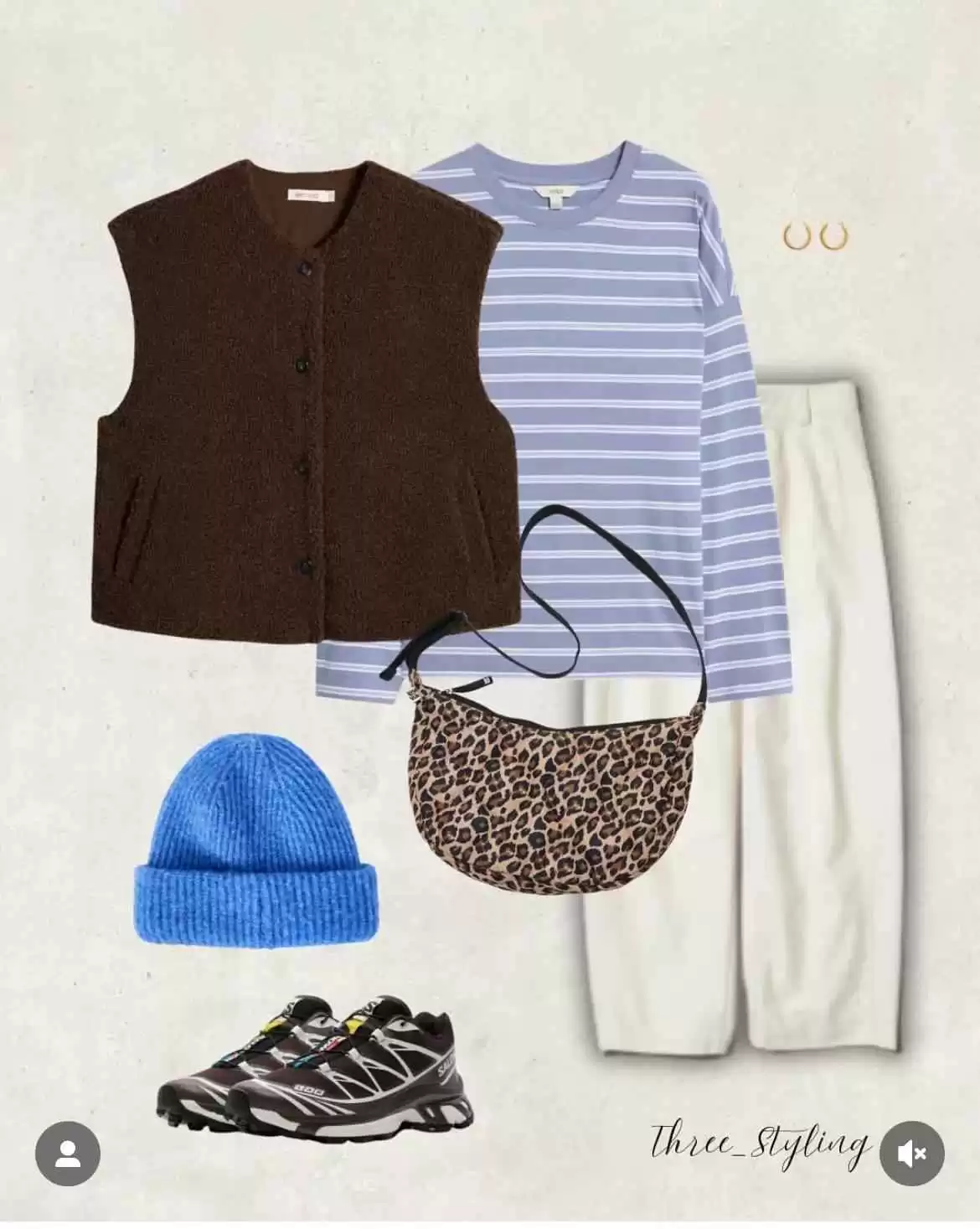 基础款叠穿也能很出彩!蓝白条纹T恤外搭摇粒绒马甲,再用同色系毛线帽呼应,冬天这么穿既保暖又活泼。