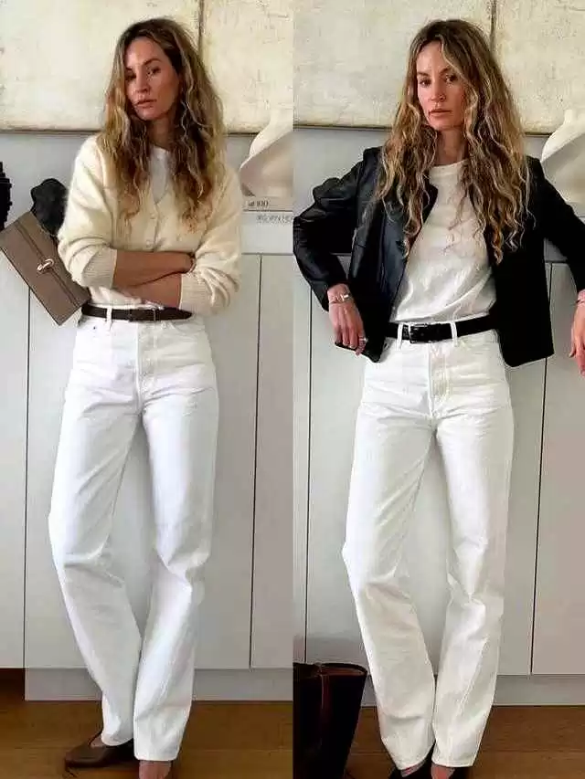 正确搭配:白T恤+直筒牛仔裤+乐福鞋+棕色托特包+细项链=干净显气质。