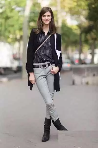 都市型格风:黑色短靴。用白色牛仔裤搭配黑色短靴(如切尔西靴),是黑白配的升级玩法。鲜明的色彩对比非常抓人眼球,风格上融合了牛仔的休闲与皮靴的酷感,适合打造个性鲜明的都市造型。