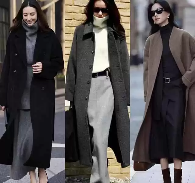 先看最吸睛的“黑呢大衣+黑裤”组合。