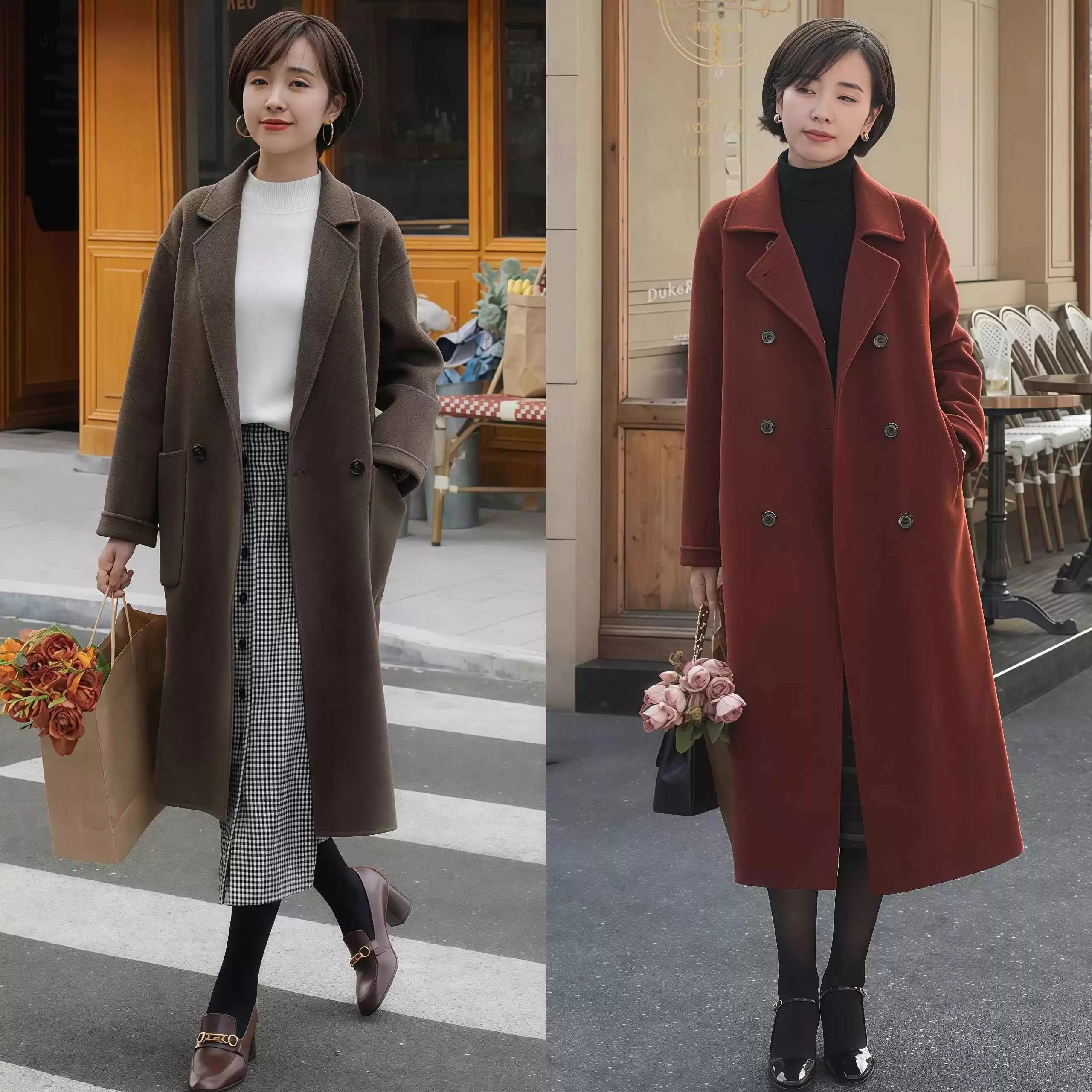 如果你是苹果型身材,或者上半身肉肉多,H型直筒大衣更友好。它的直线条剪裁能修饰身形,穿厚毛衣也不显臃肿,看起来特别利落。