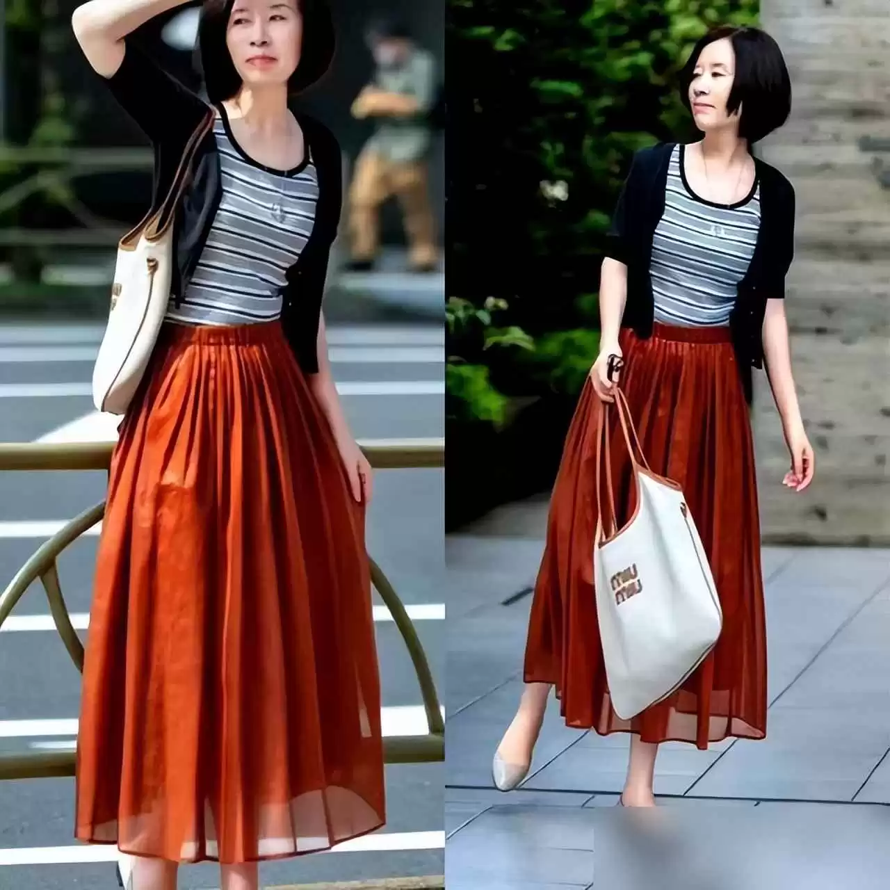 比如黑白搭配,加个米色手袋,立马显露出成熟女性的优雅;如果觉得单调,配个橘色斜挎包,瞬间增添活力——亮点小巧才精致,比穿鲜艳长裙更减龄。