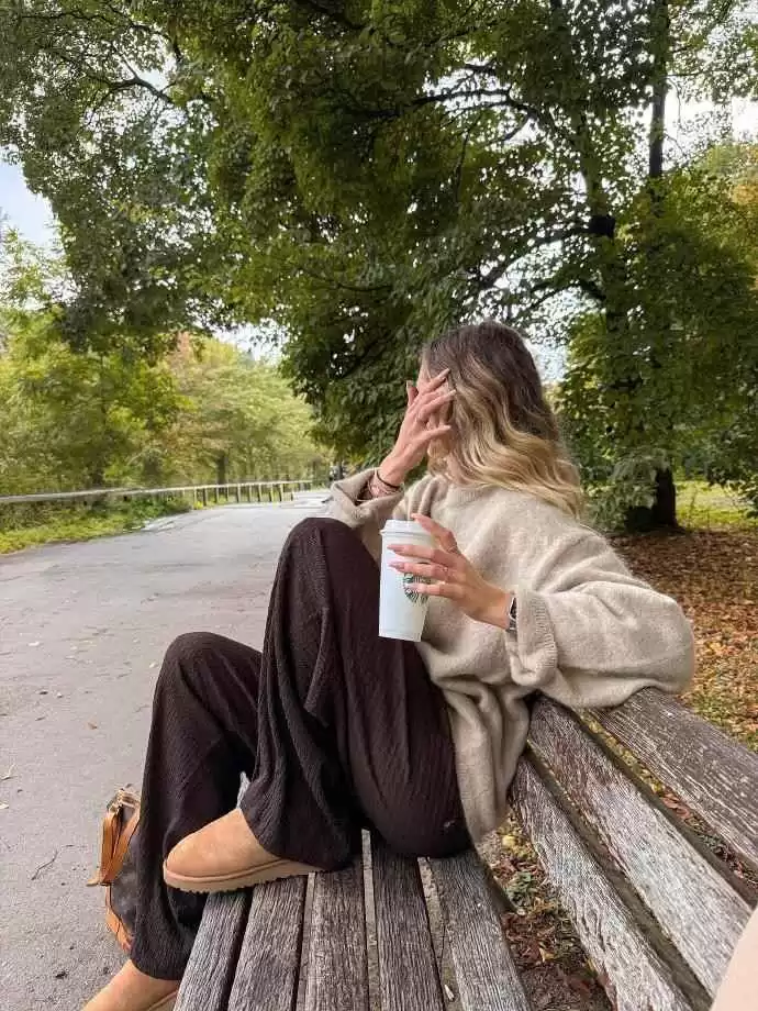 针织阔腿裤面料柔软有型,尤其是拖地款,容易穿出慵懒时髦感。上身配柔软毛衣,秋冬温暖又柔和,整体风格轻松自在。