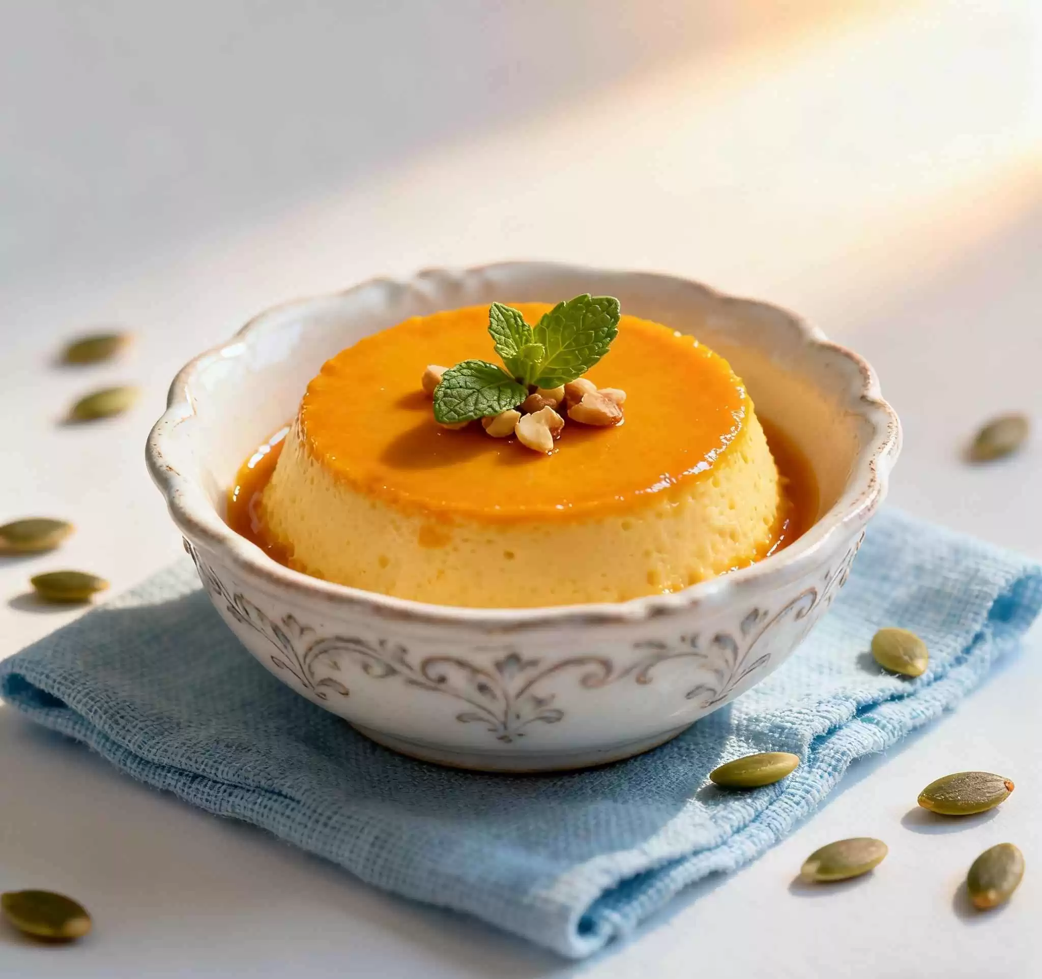 用小南瓜挖空作碗,倒入鸡蛋和牛奶调制的丝滑混合物