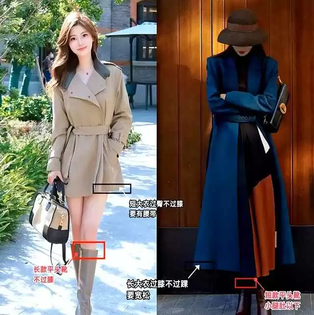 她们都穿着驼色长款大衣,脚下搭配黑色平头靴,靴筒刚好包裹住脚踝上方。