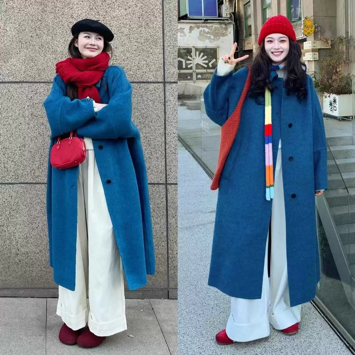 雾霾蓝大衣配白色阔腿裤简直是冬季绝配!雾霾蓝这种低饱和度色系自带高级清冷感,对黄皮特别友好,加上白裤子的提亮效果,清新又显白。选一件中长款茧型大衣,能完美隐藏身材小缺点,再搭条围巾或帽子,氛围感立马拉满。这套不管是上班还是出游,都能让你气质爆棚。