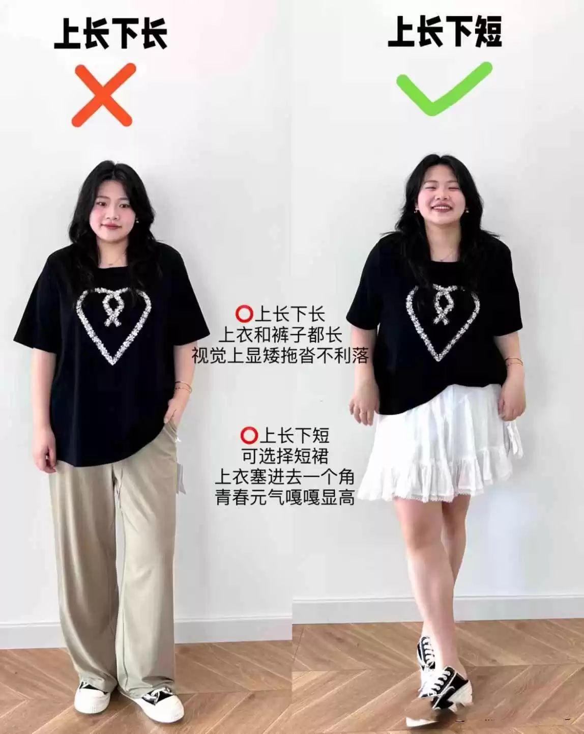 上短下长的搭配能突出轻盈感,即使腿部有肉,配一条飘逸的半身裙也能浪漫又显瘦。相比宽松T恤搭阔腿裤,这种穿法更显利落,视觉上瘦一圈。