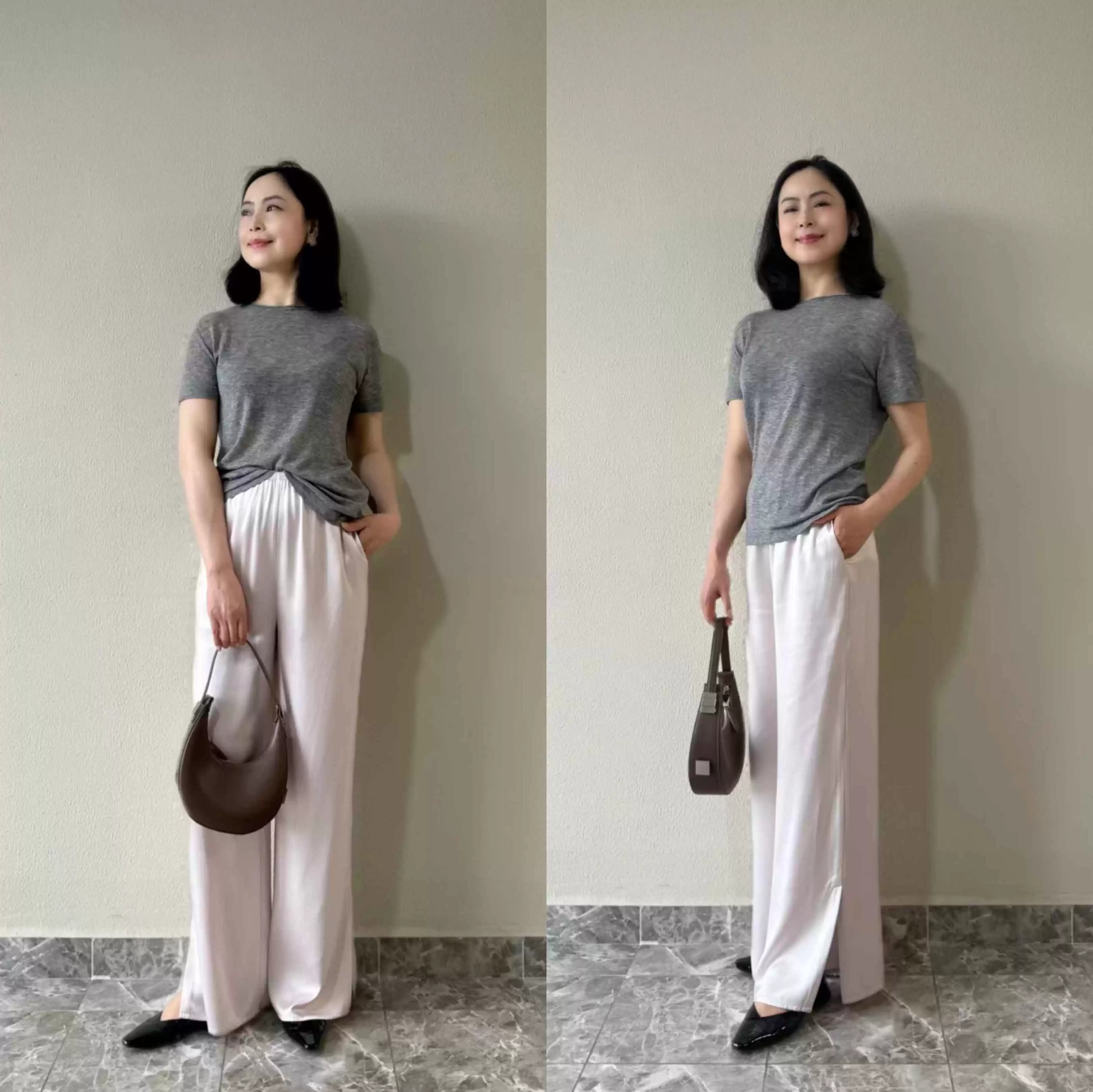灰色T恤低调百搭,配上米色休闲裤的柔和色调,缎面材质让整体看起来轻盈有光泽——垂感面料自然修饰身形,走动时泛着柔光,既保留了休闲装的轻松感,又用质感打破单调,50+女性轻松穿出随性时髦范儿。