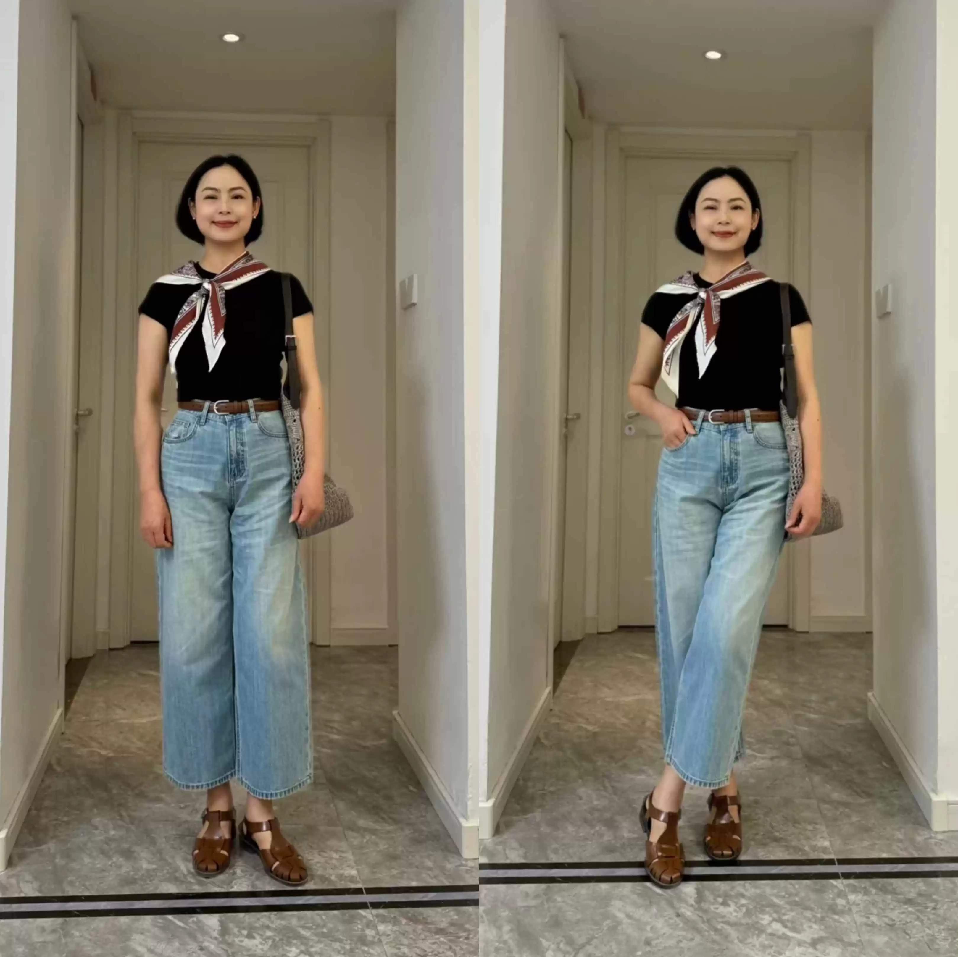 黑色T恤稳重显瘦,配九分牛仔阔腿裤大气十足,棕色腰带点明高腰线,凉鞋和腰带颜色呼应更显心思,脖子系条小丝巾增添灵动,瞬间打破基础款的平淡,50+女性这样穿休闲装,精致和档次都到位。