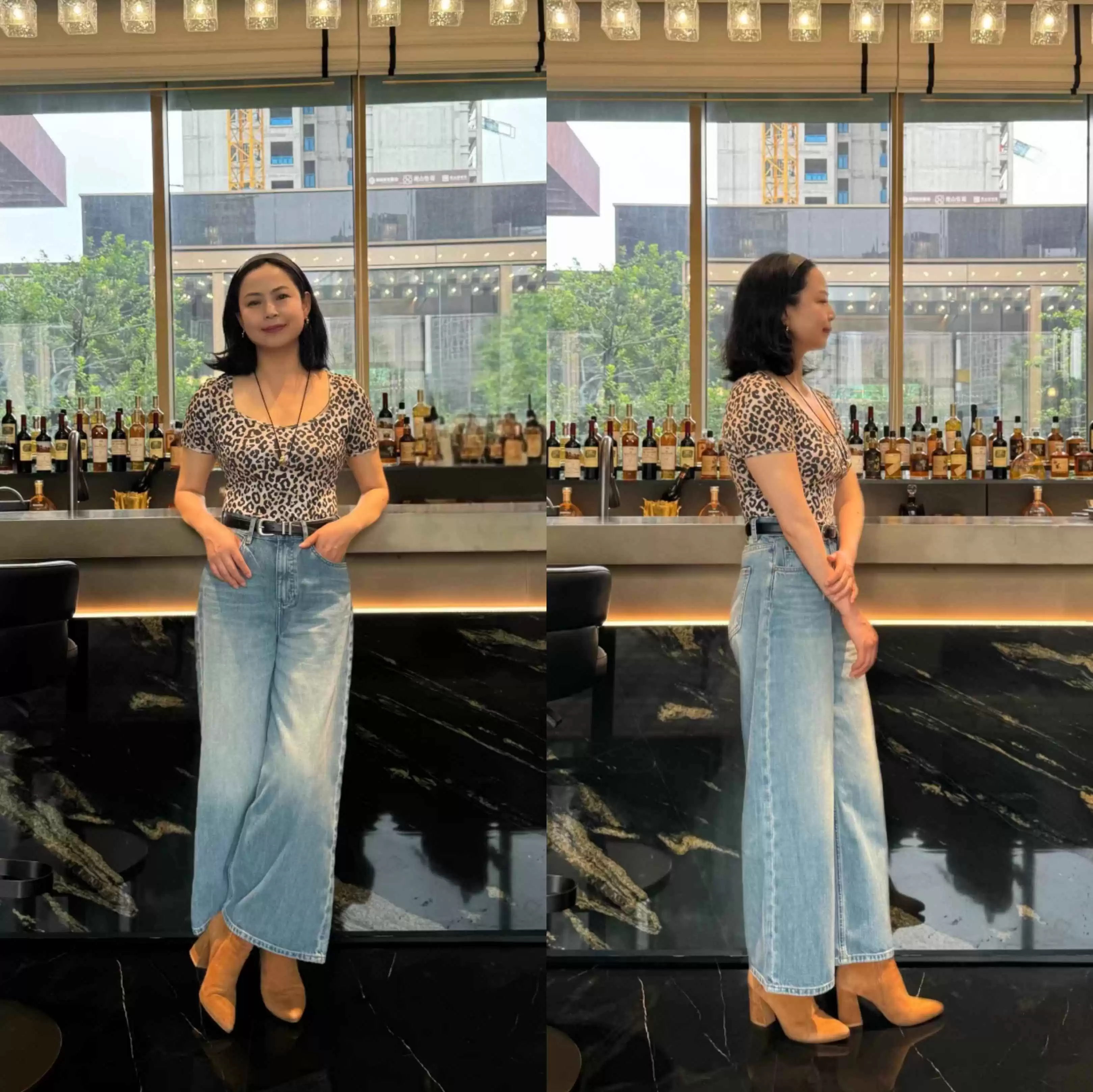 豹纹修身T恤带点野性却又不夸张,大方领设计露出锁骨,修饰肩颈线条;搭配九分牛仔阔腿裤,利落版型平衡上衣的张扬,一紧一松凸显身材曲线。整体造型既有成熟女人的韵味,又不失轻松随性感,50+穿出独特气场。