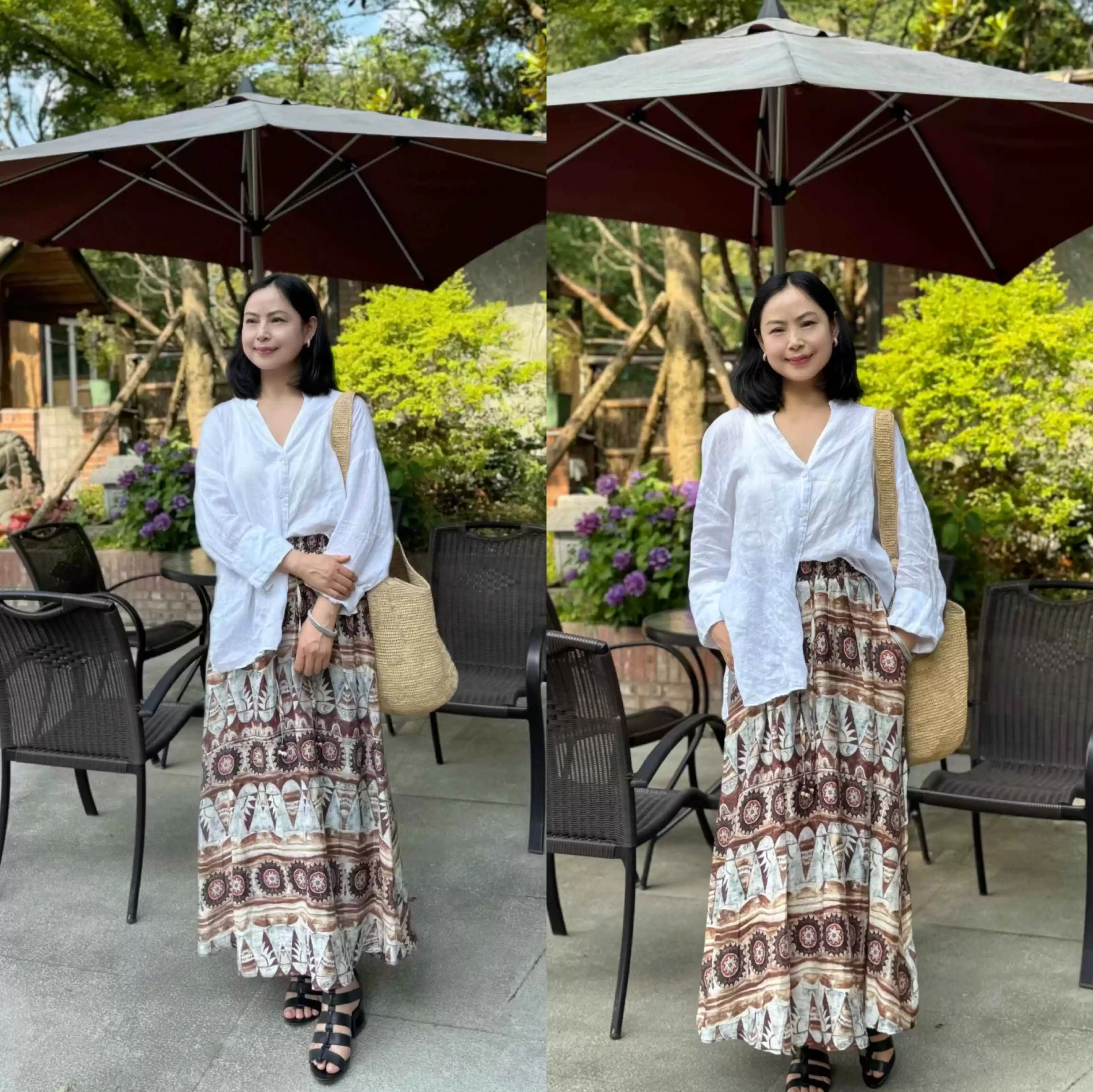 白色棉麻衬衫带着自然纹理,慵懒又文艺,配高腰碎花半裙,把衣角一边塞进裙子,悄悄提高腰线还保持随意感。碎花和纯白搭配清新不腻,宽松设计遮肉显瘦,50岁女性穿出法式田园风的轻松优雅,美得自然。