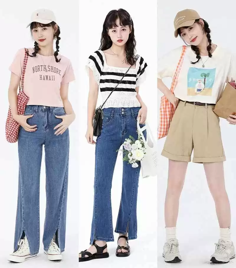 甜美元素自然自带少女感,如果想穿得更日常,可以选浅色系字母印花T恤或卡通印花T恤,休闲又减龄。
