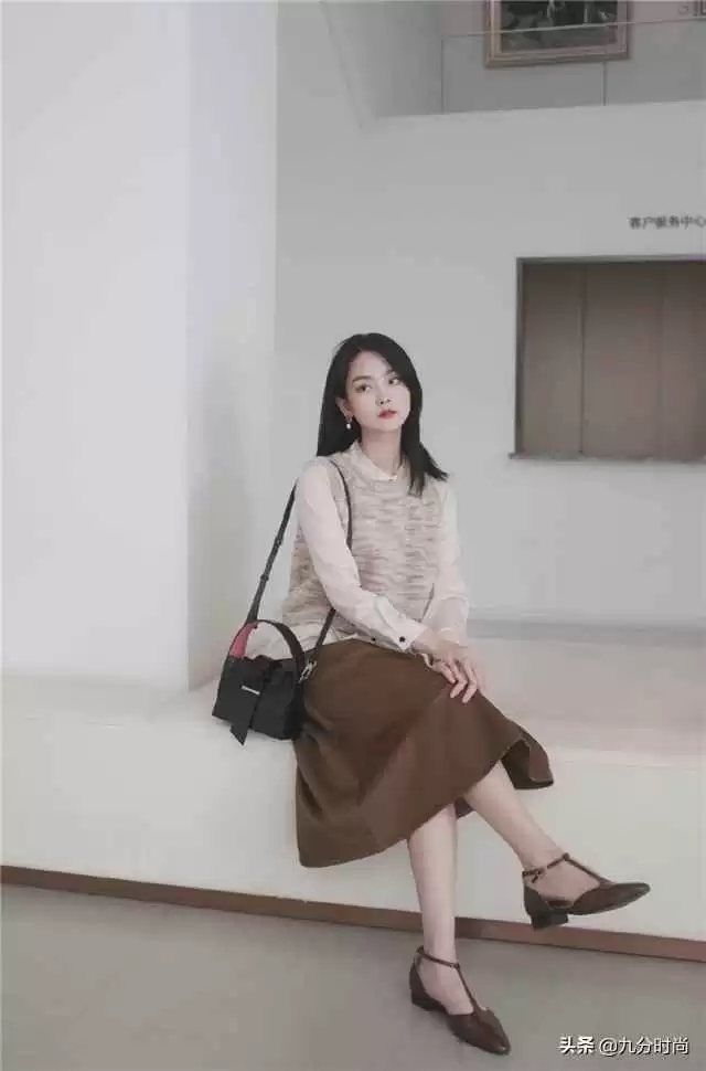 这身在衬衫外加了针织背心,全身棕色系但深浅不一,沉稳又不老气。关键用了同色系叠穿,浅、中、深三色增加层次感。