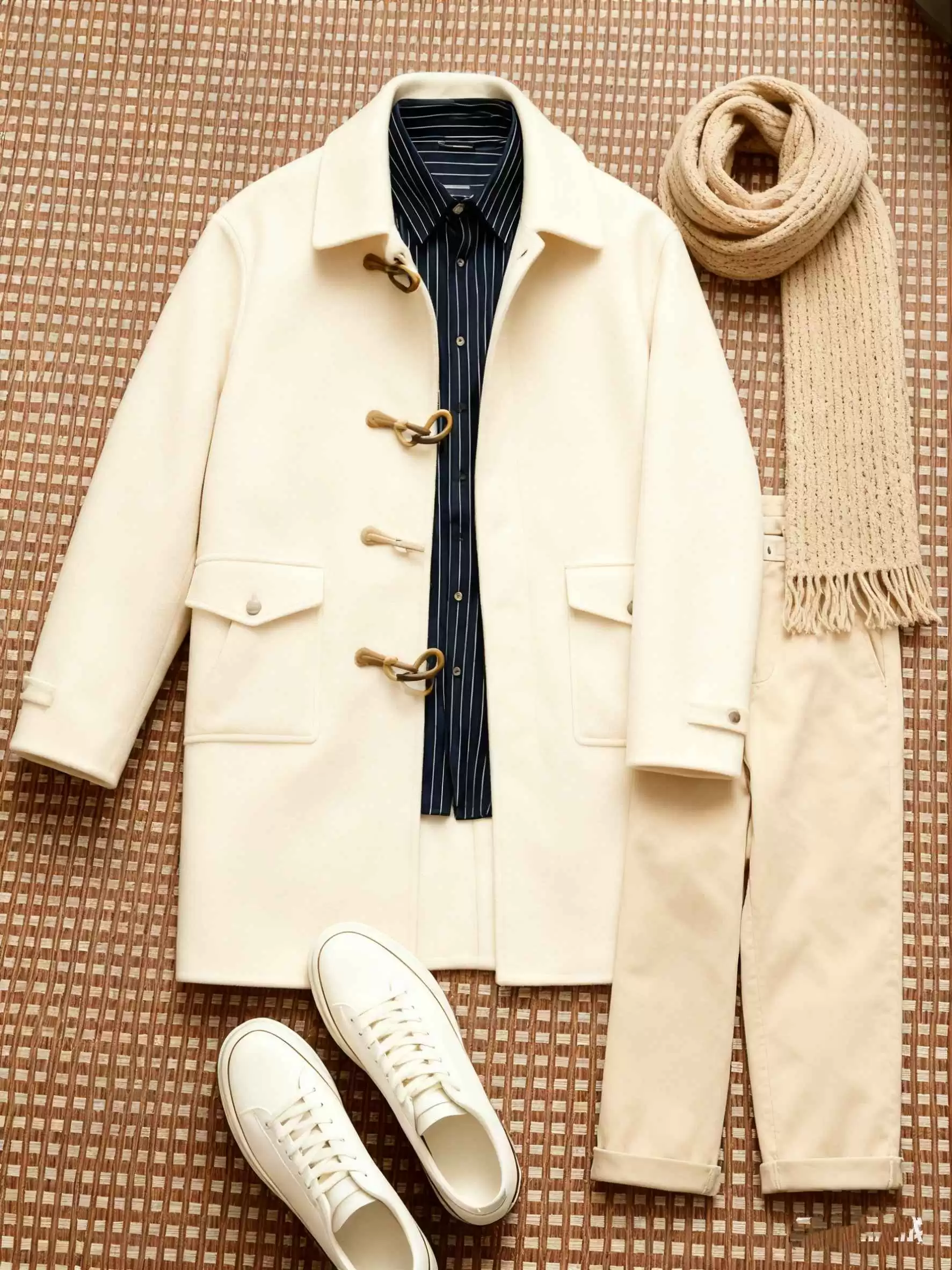 配色:米白色(牛角扣大衣)+藏青细条纹(衬衫)+浅卡其色(休闲裤)+浅驼色(针织围巾)+白色(板鞋)
