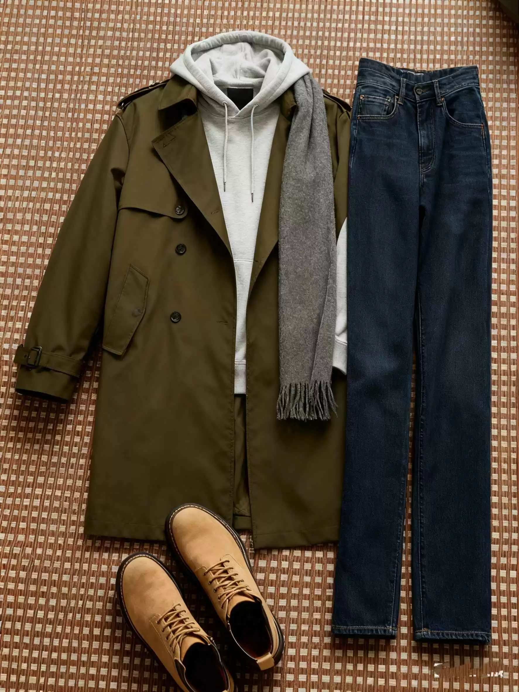 配色:军绿色(风衣)+浅灰色(连帽卫衣)+深牛仔蓝(牛仔裤)+浅灰色(围巾)+卡其色(工装靴)