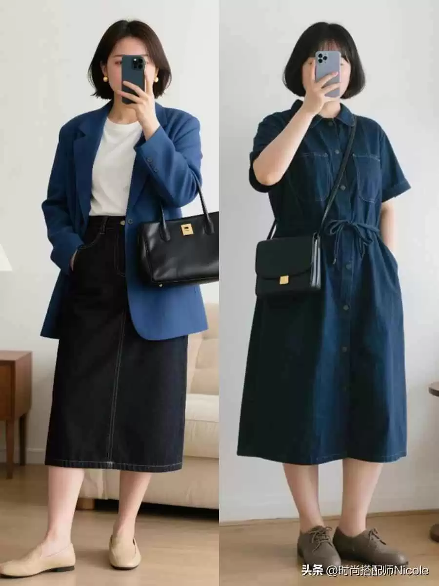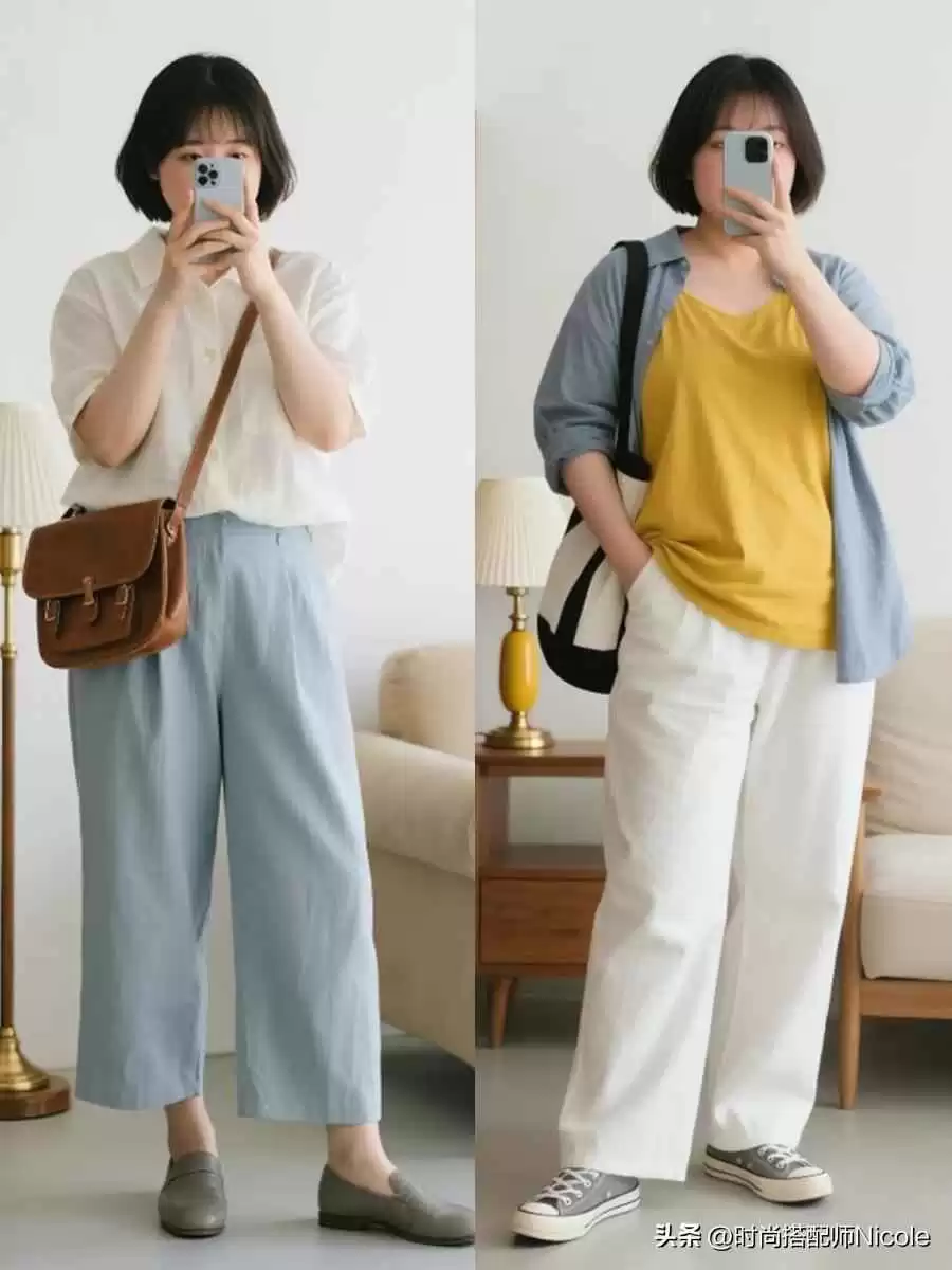 不管你选九分还是拖地,“高腰”必须是铁律!它能从根本提升腰线起点。在此基础上,选“直线条”下装,比如直筒裤、阔腿裤、H型连衣裙,能更好修饰微胖腿型,拉直线条,隐藏腿弯、肌肉腿等问题。
