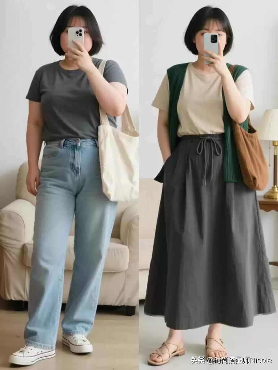 最佳选择是带点空间感的“微宽松”版型,比如略阔的短T恤、垂感好的短吊带。它们既能标出高腰线,又能给肚子留余地,藏肉于无形。