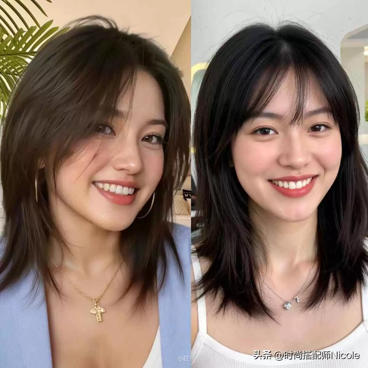 这是最不挑人、最百搭的“不过肩”发型。长度在锁骨左右,通过高层次剪裁,在头顶和后脑勺制造蓬松度,有效“垫高”颅顶,让头型更圆润。