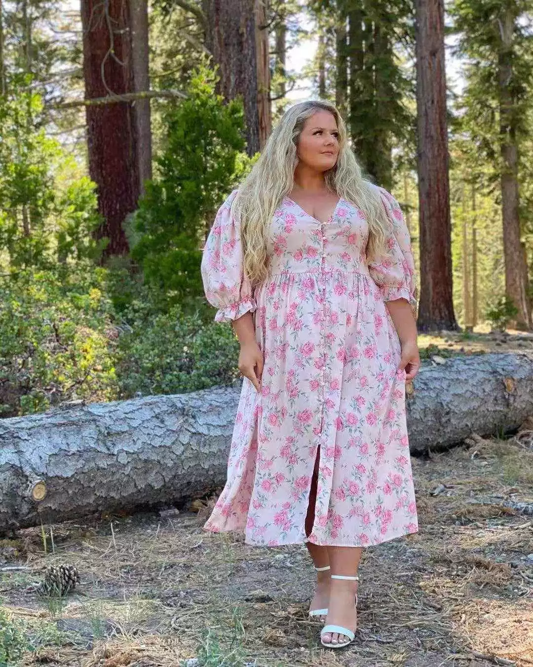 很多人觉得胖就要全遮住,其实相反,适当露肤更显瘦。这条裙子虽然用了V领,但裙摆太长,显得胯以下特别粗壮,加上过长设计,视觉上又矮又胖。另外,胖女孩一定要避开泡泡袖。