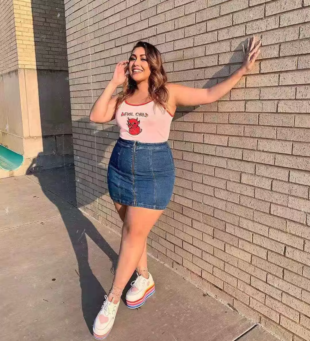这身搭配是显瘦经典款,拉链牛仔半裙个性百搭,上身配粉色印花吊带,衣摆塞进裙子拉高腰线,再穿厚底鞋延长腿部线条,从头到脚都显瘦。记住吊带别选太粗的,细吊带更精致。