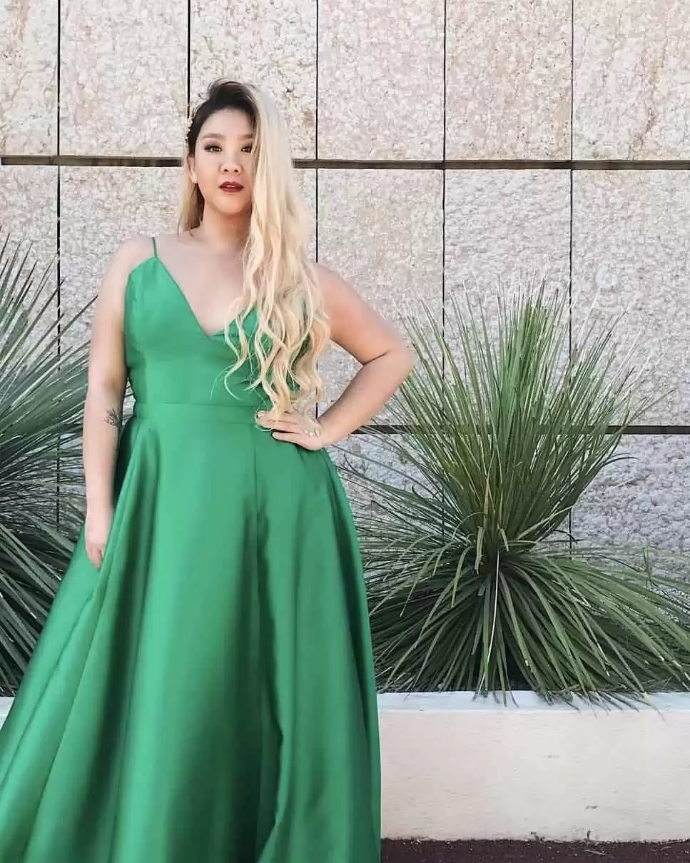 绿色缎面吊带连衣裙高级不俗气,长款设计加巧妙剪裁,显瘦又时髦。郑欣宜证明胖女孩也能性感出击。声明:文字原创,图片来自网络。如有侵权,请联系我们删除,谢谢!