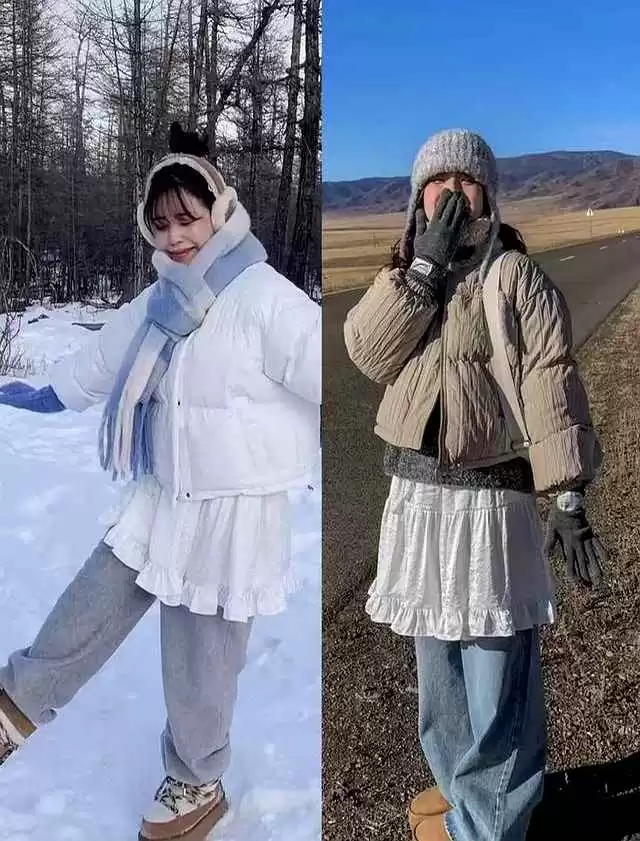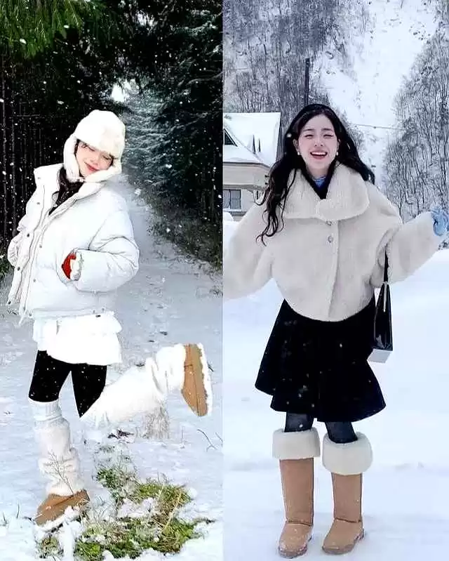 短款羽绒叠穿短裙时,她把羽绒长度卡在腰部最细处,裙摆从大腿中间展开,微微露出打底裤边,制造“腿从裙子里延伸出来”的视觉错觉。打底裤选雾面黑色,不反光,像给腿部打了阴影。雪地靴是奶油白色,色块向上延伸,脚背和腿连成一片,减少分段感,脚踝看着就细了。