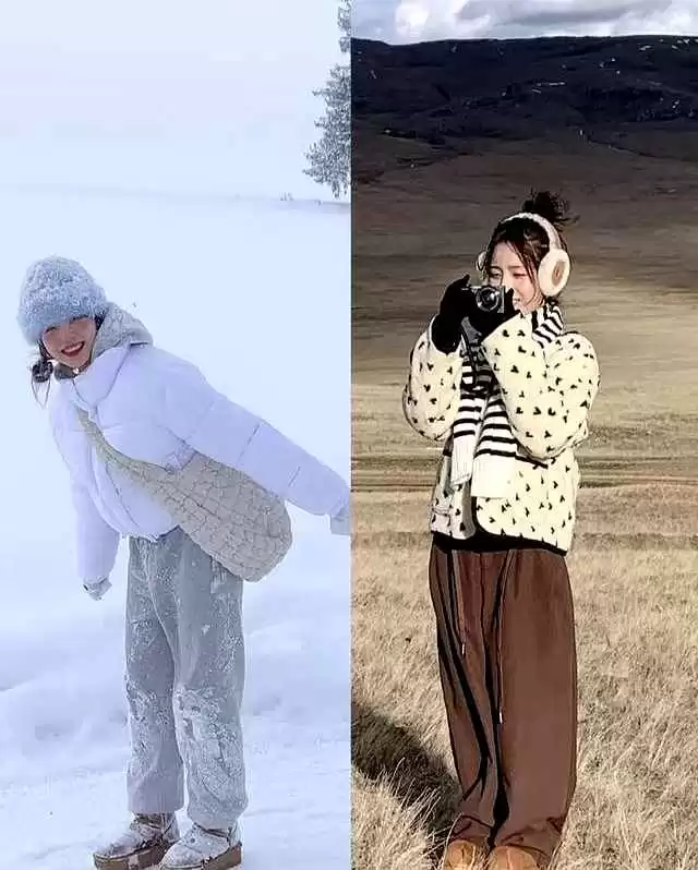 浅色雪地靴是她的隐藏心机。她算准冬天街道背景灰暗,奶油白靴子一跳出来,镜头自动对焦。深色靴子融进背景,人就被衣服吞没。白靴不耐脏,她拍三天就扔一双,成本算进广告费,普通人穿一次地铁就报废。