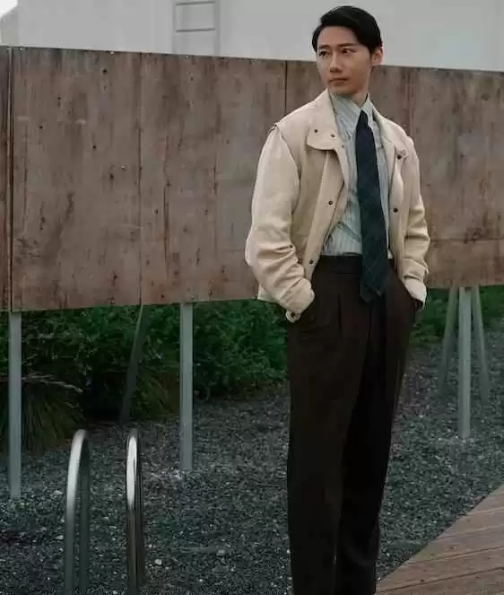 夹克下摆刚好盖过皮带,长度在屁股中间,视觉上拉高腰线3厘米,肚子瞬间隐形5厘米。