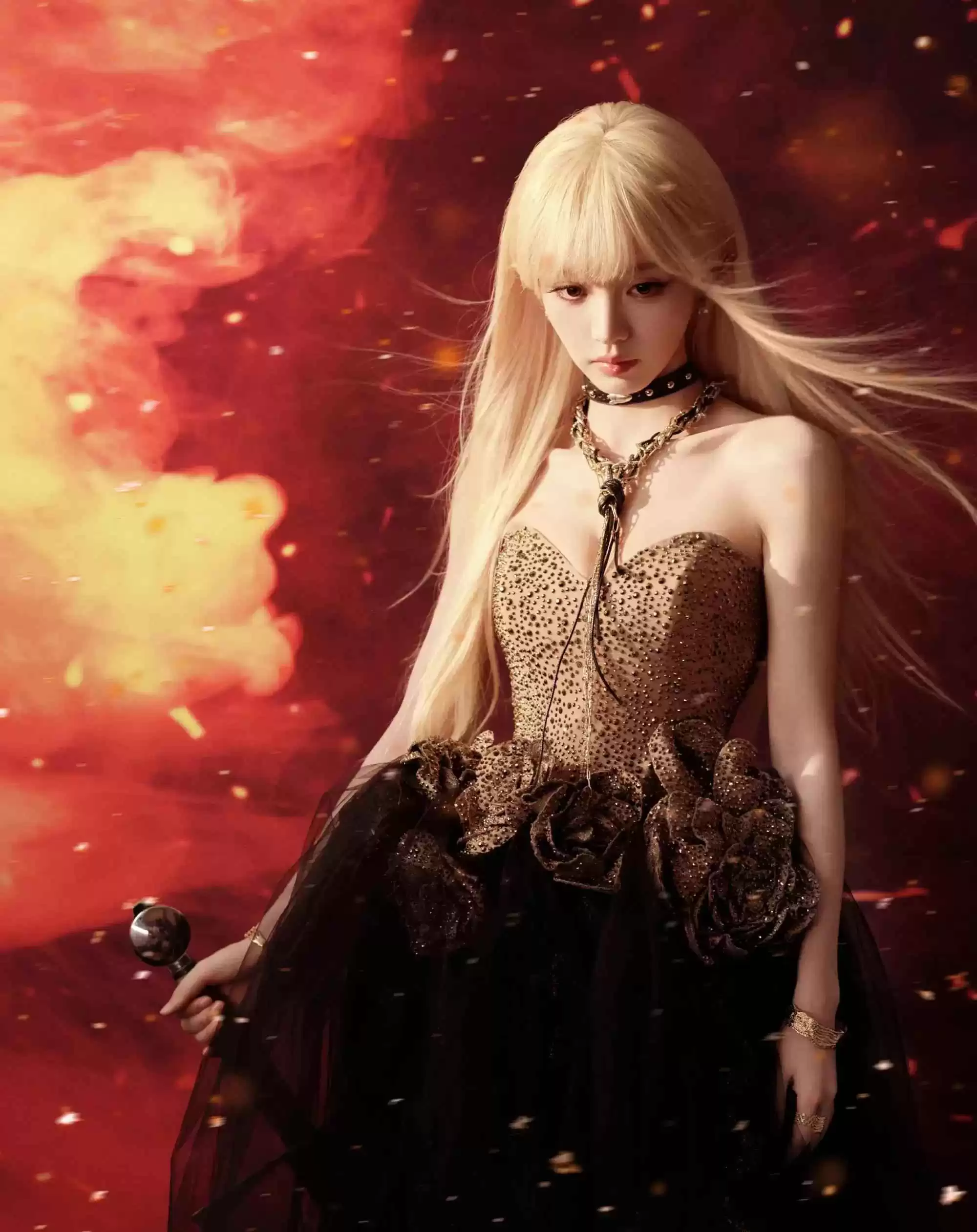 当烟雾升起,她宛如踏花而来,脖颈上的水滴钻石闪耀火彩,像太阳迸发光芒,让她笼罩在神秘氛围中。