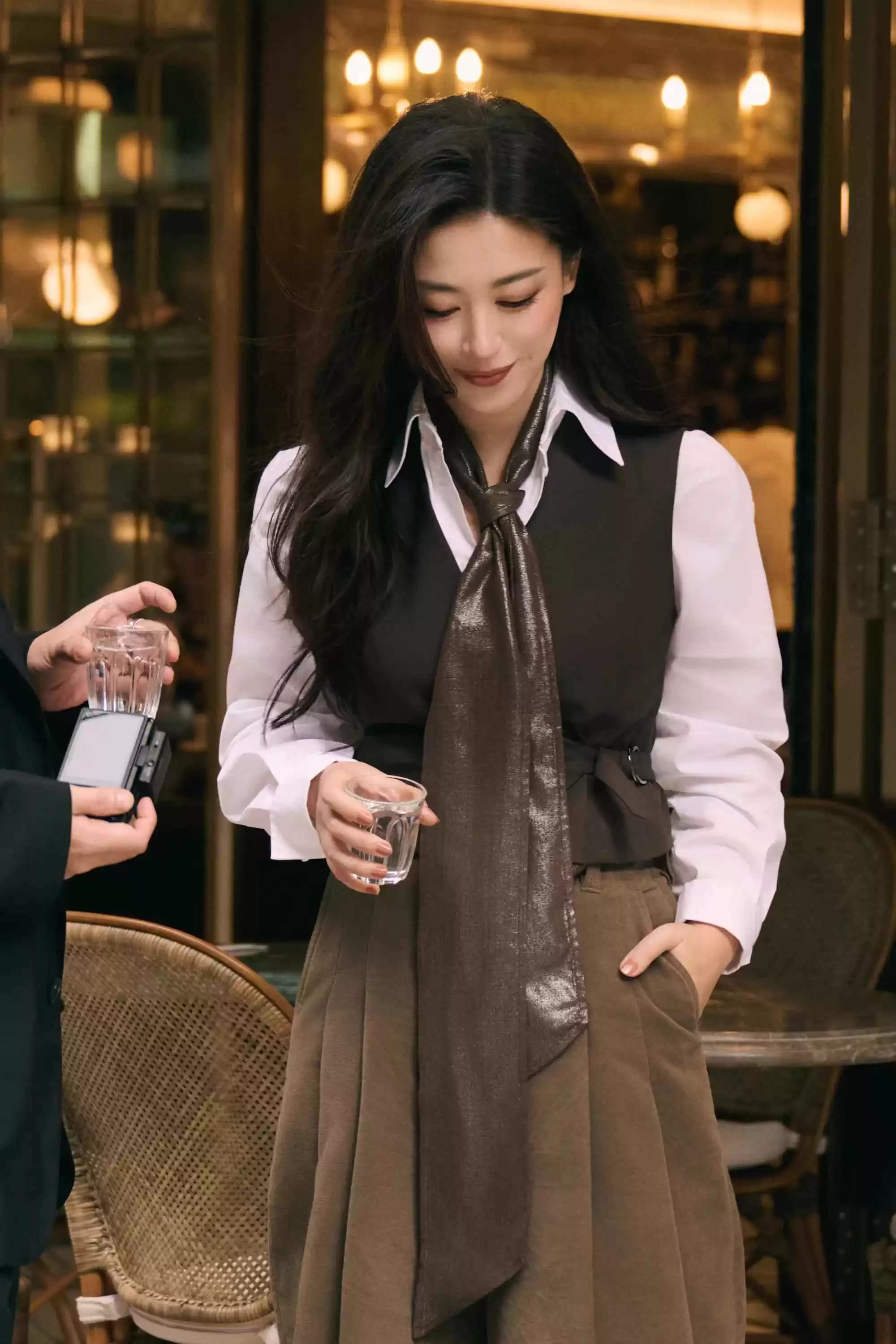 轻纱长裙柔和地反射着暖光,和她温暖的笑容相得益彰。这身造型完美体现了“琥珀流光”系的精髓——在棕色系基础上加入亮眼细节,为秋冬注入能量。