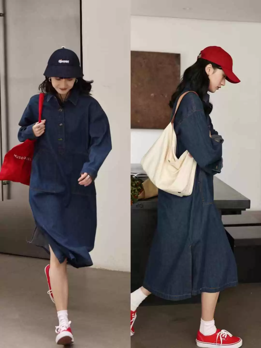 深色牛仔裙其实很挑人,显瘦却容易沉闷。但加点红色立马不一样!小面积红色提亮又不浮夸,瞬间注入少女感。