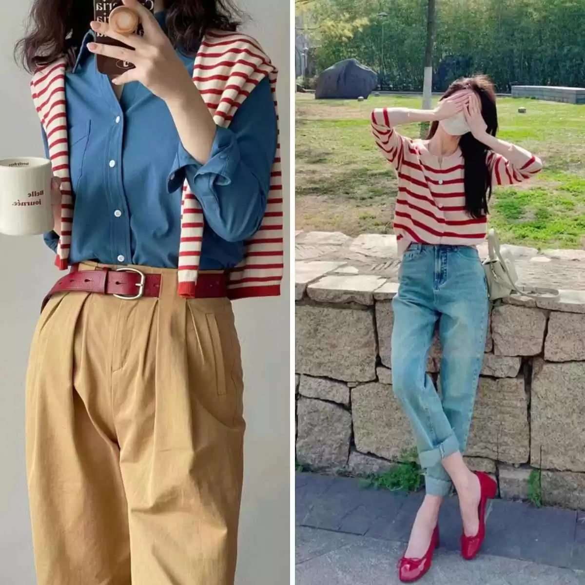 如果说全红搭配是美式复古,那红条纹+牛仔就是法式风情,少了几分张扬,多了几分温柔,适合走轻熟路线的姐妹。