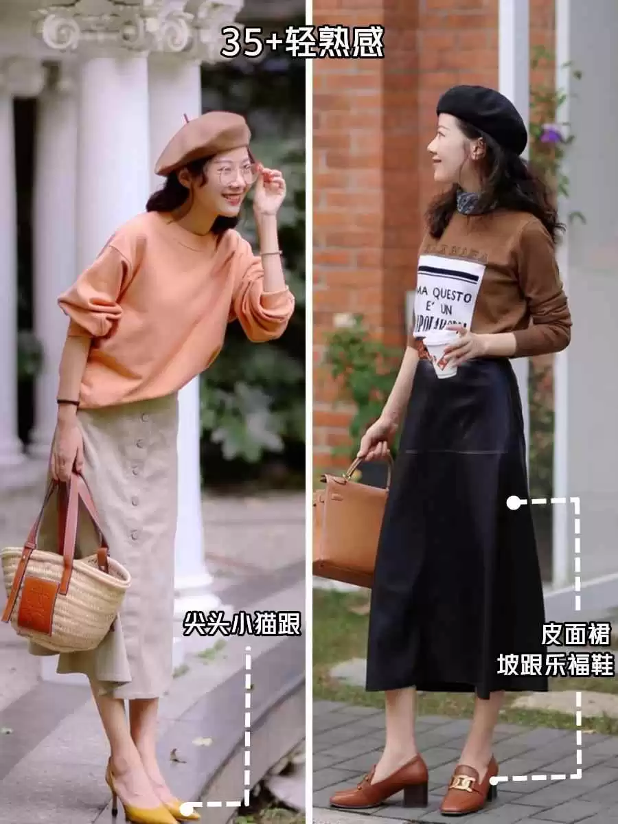 35+的轻熟风也能驾驭,关键是加入女性化单品:高跟鞋、皮质半裙、乐福鞋等。