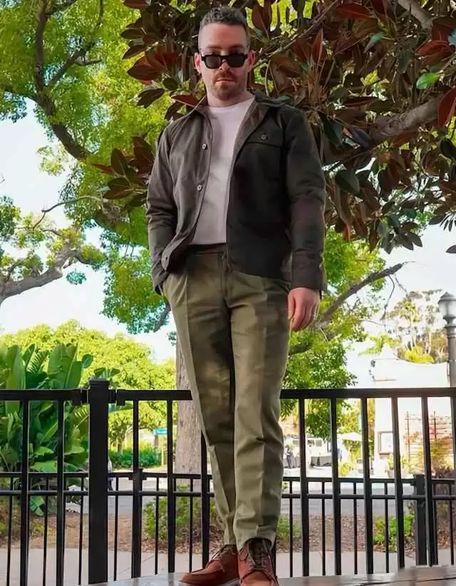 3 颜色搭配要层次分明全身颜色别超过三种,但40岁要玩出渐变效果:- 外层皮夹克选深军绿色,比黑色活泼,比棕色稳重;- 中间内搭用灰调羊绒衫,饱和度低,过渡自然;- 裤子选浅卡其色,把视觉拉回大地色系。远看低调,近看有细节,像好茶一样回味足。鞋子可以配沙色切尔西靴,和裤脚衔接流畅,显腿长,整体色系统一,拍照很上镜。