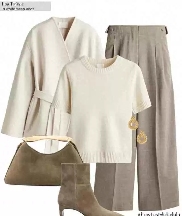 比如,一件短款奶油白外套配淡咖色阔腿裤,再加双短靴,轻松穿出利落优雅的造型。