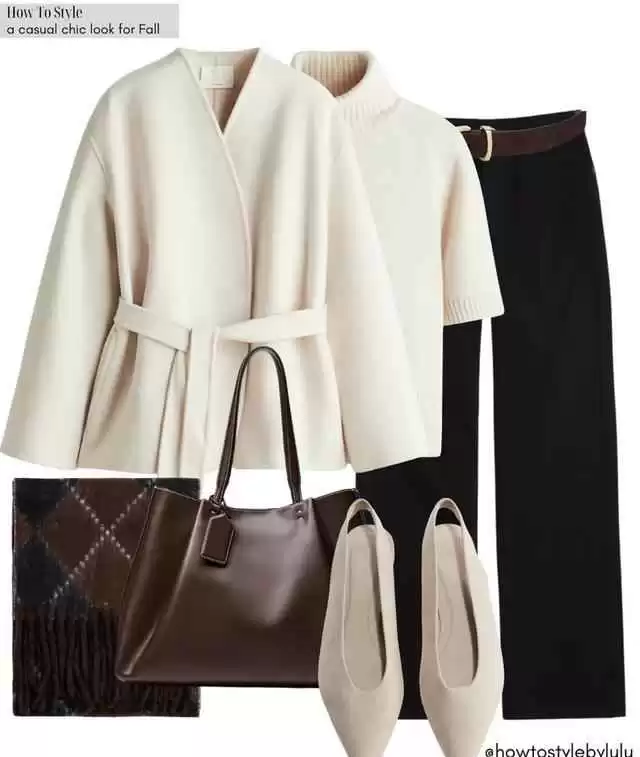 具体搭配方案也超多:流线型奶油白外套配淡咖色阔腿裤,或者巧克力色西装外套内搭白色高领毛衣和深色牛仔裤,系上菱格纹围巾,上班逛街都合适;茧型长大衣里面穿高领无袖上衣和高腰直筒裤,显得干练有型。
